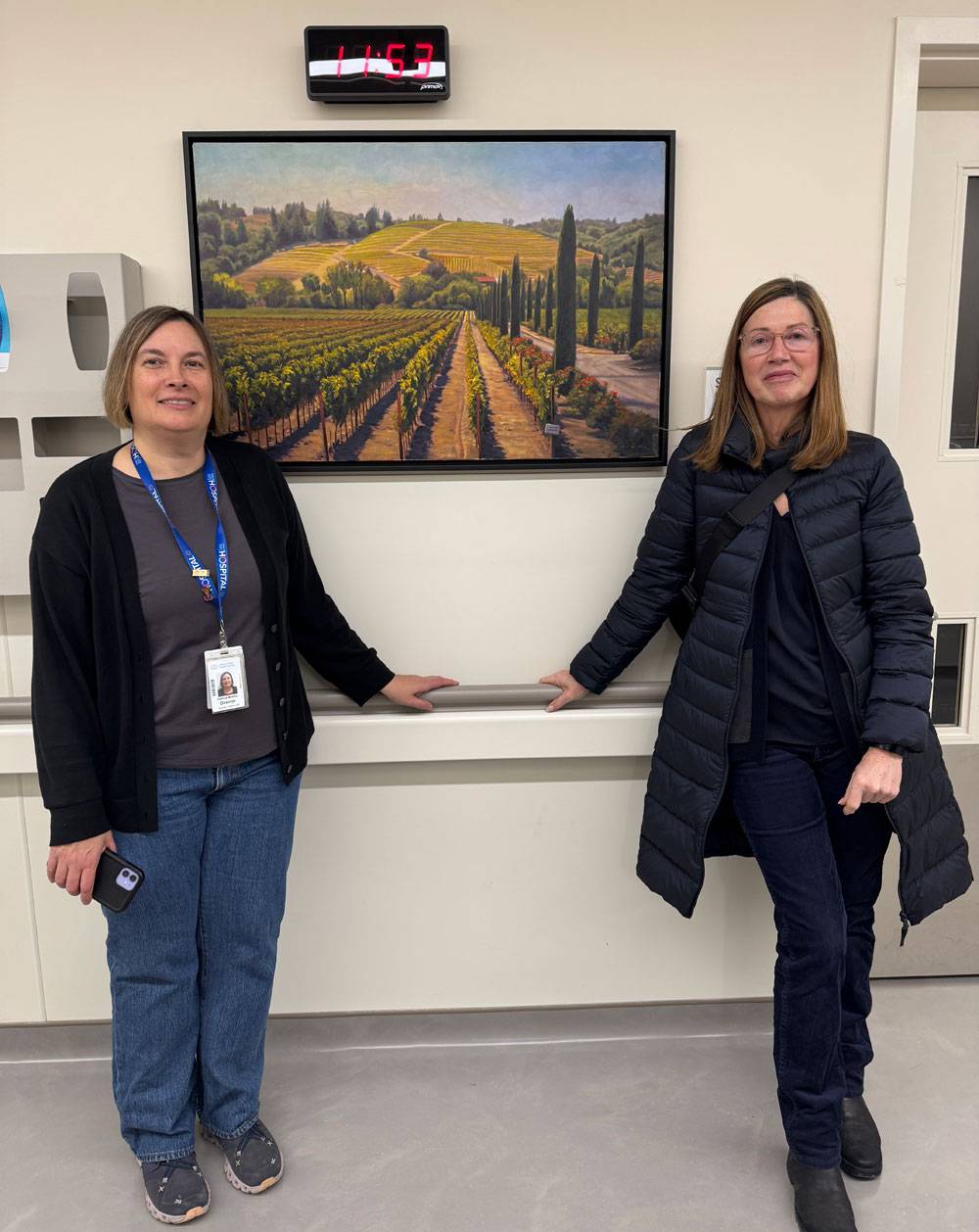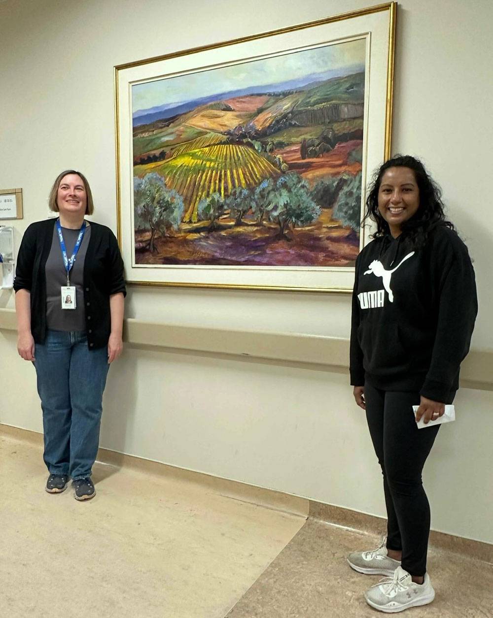 Patricia Mosnia, Clinical Director – Oncology and Palliative (left) and Shalini Fernandes, Clinical Services Manager – Oncology/Palliative, Brampton Civic Hospital (right) are delighted with the addition of the painting Tuscan Morning by Joanne Clarke to the Inpatient Oncology/Palliative Care Unit.
