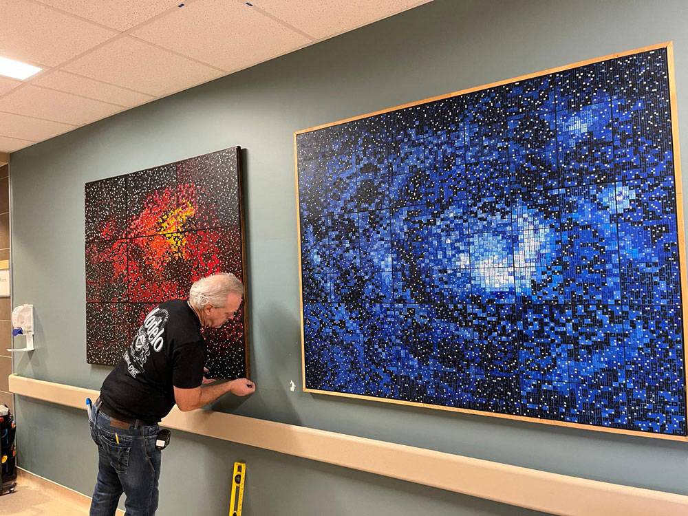 ArtWorks for Cancer team member Don Tannahill's logistics and installation skills ensure every painting is beautifully and safely displayed in every hospital setting. Here, Don installs Veronica K. Fierke's Laguna Nebula, 2022 and Eagle Nebula, 2013 in the Inpatient Oncology/Palliative Care Unit of Brampton Civic Hospital.