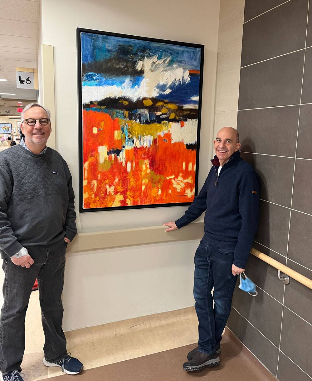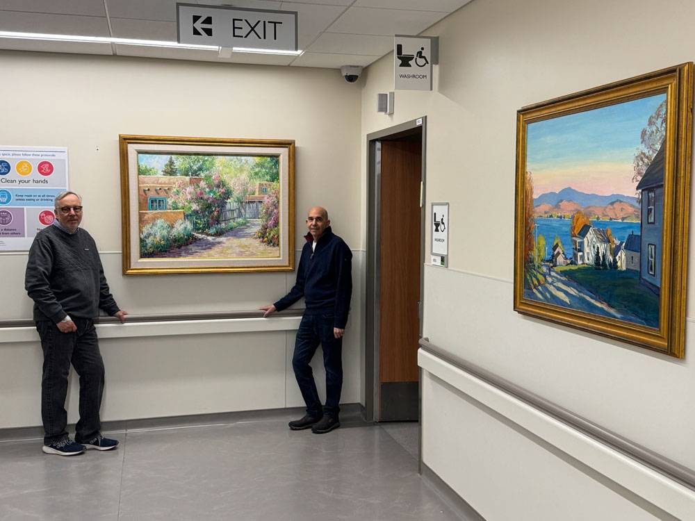 In a hallway of Etobicoke General Hospital's Cancer Centre, ArtWorks for Cancer's (left to right) Michael Weinberg and Bert Amato turn their gazes to Luella’s Lilac Lane, 1996 by Joseph U. Horton, Fall on the Lake by Eric Tobin is nearby on an adjoining wall.