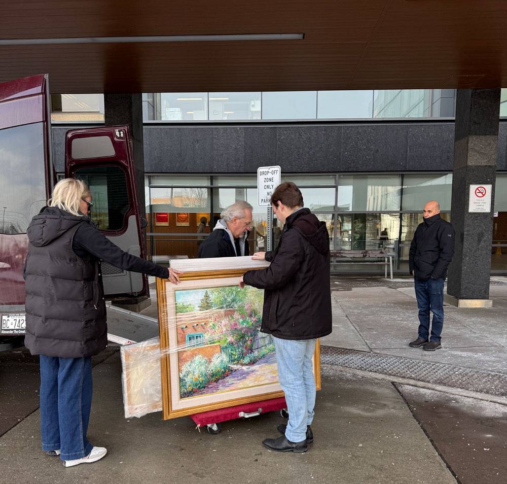 The ArtWorks for Cancer team of Sharon Suter, Don Tannahill, Michael Murphy and Bert Amato arrive outside William Osler - Brampton Civic Hospital and begin carefully unloading the paintings to be installed in the Inpatient Oncology/Palliative Care Unit.