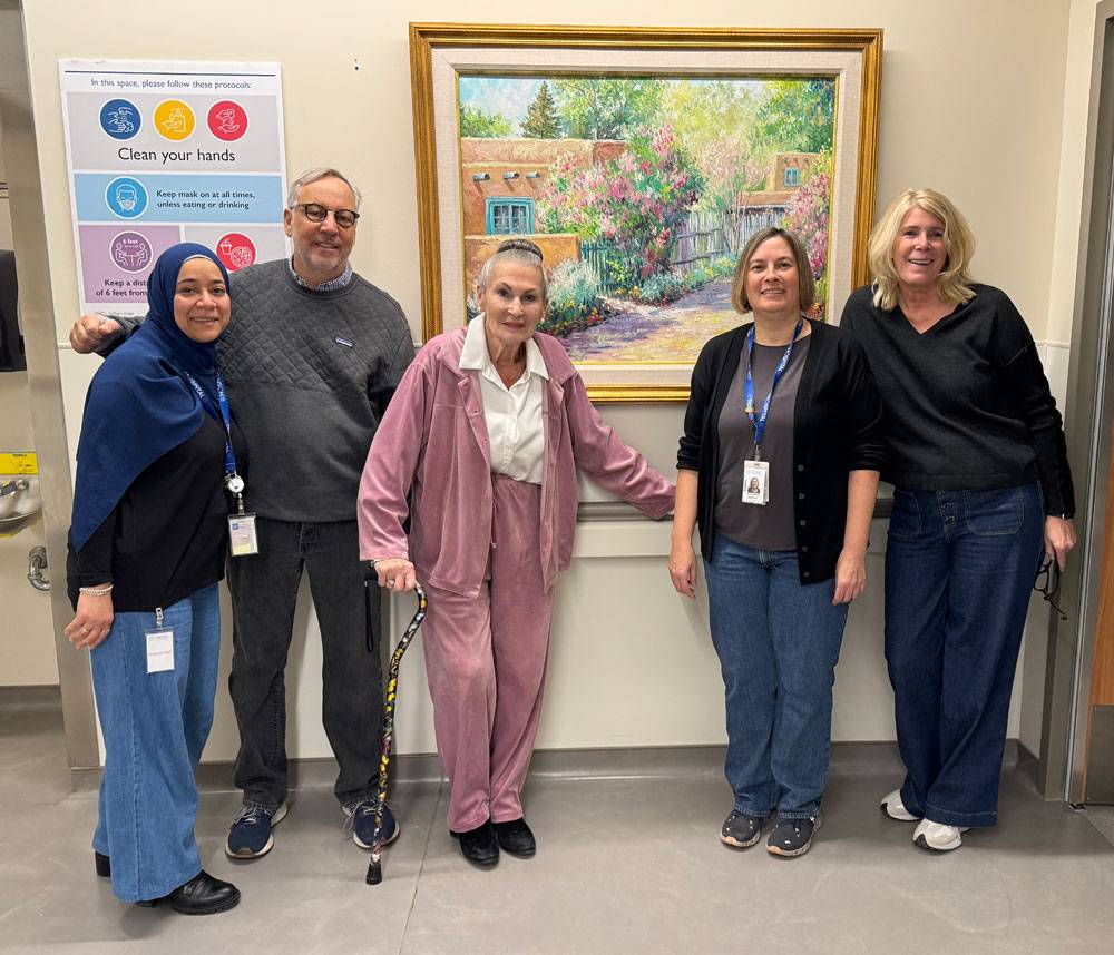 A warm gathering around the painting Luella’s Lilac Lane, 1996 by Joseph U. Horton in a hallway of Etobicoke General Hospital's Cancer Centre includes (left to right) Samar Saeed, Manager – Oncology, ArtWorks for Cancer board members Michael Weinberg and Beverly Schaeffer, Patricia Mosnia, Clinical Director – Oncology and Palliative, and ArtWorks for Cancer board member Sharon Suter.