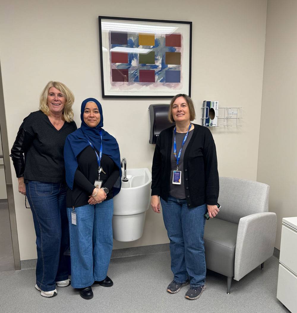(Left to right) AWFC's Sharon Suter and Etobicoke General Hospital's Samar Saeed and Patricia Mosnia are delighted with Christopher Estridge's piece Threesome, brightening a corner of the hospital's Cancer Centre.