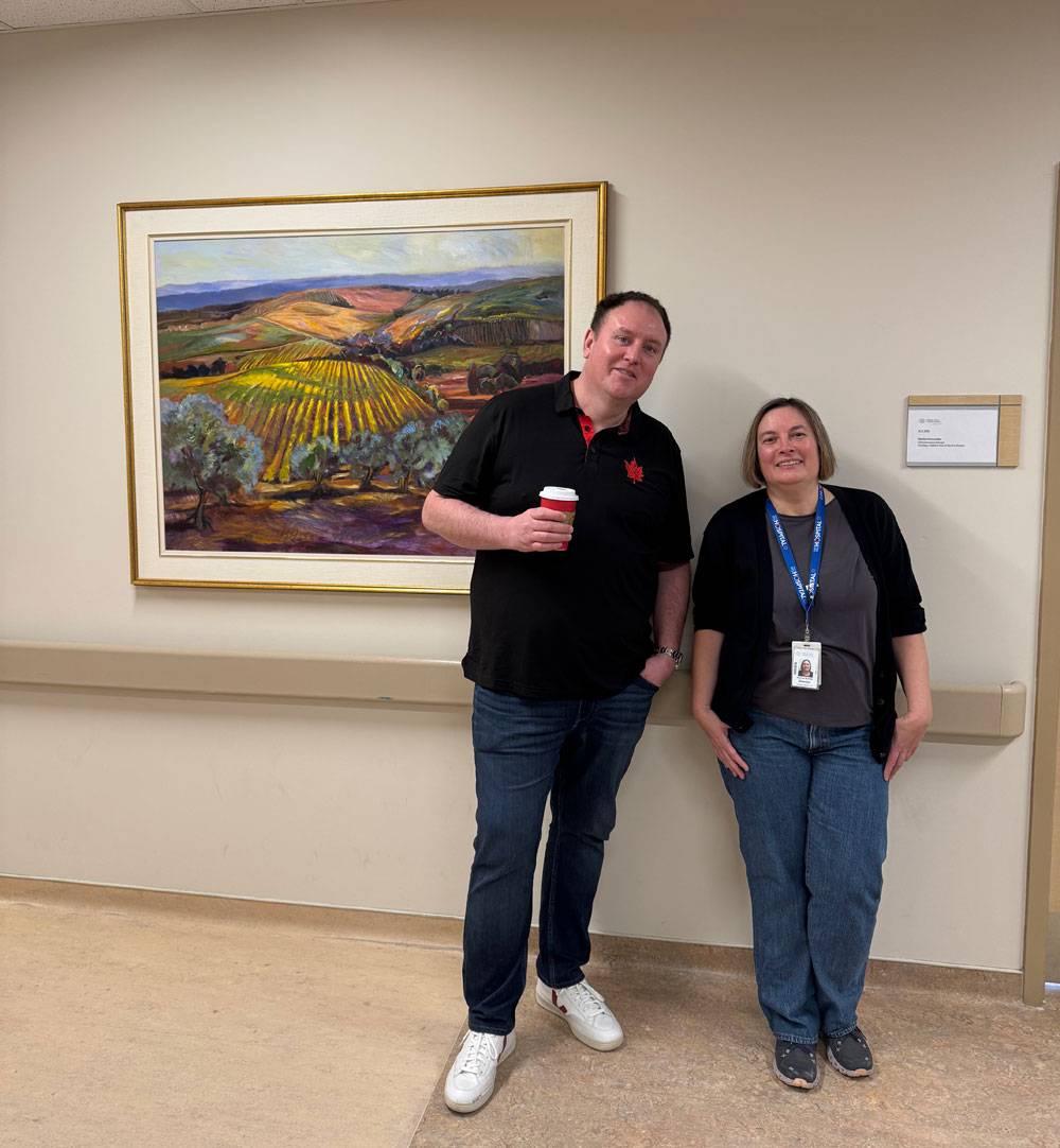 ArtWorks for Cancer team member Alan Loch of Loch Galleries (left) and Patricia Mosnia, Clinical Director – Oncology and Palliative, Brampton Civic Hospital (right) pause to drink in the work Tuscan Morning by Joanne Clarke in the Inpatient Oncology/Palliative Care Unit.