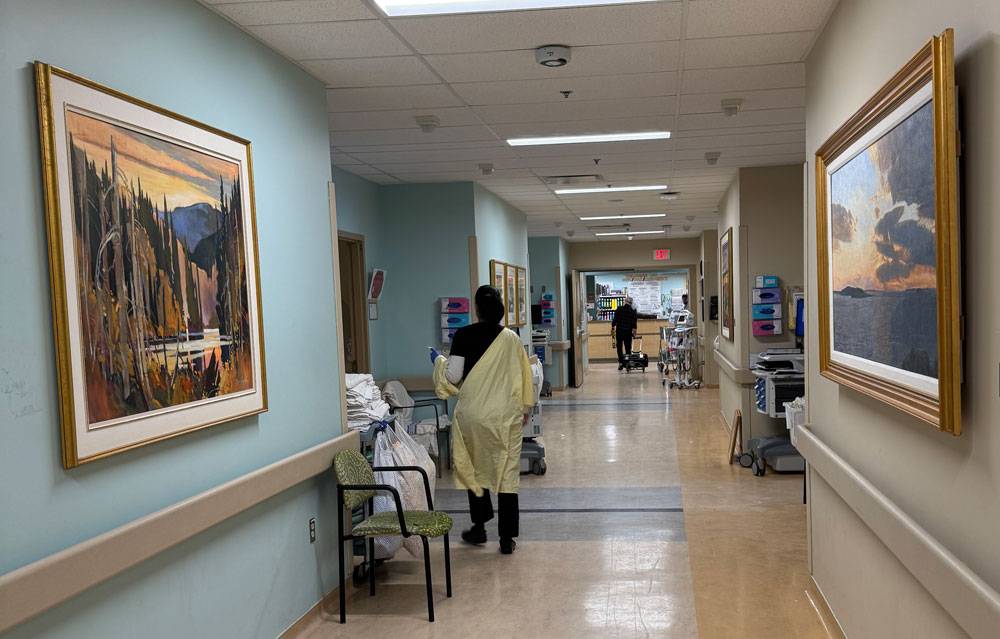 The walk along this hallway of the Inpatient Oncology/Palliative Care Unit of William Osler - Brampton Civic Hospital is brightened by the paintings Approaching Twilight by Conley Harris (left) and Algonquin Portage by Brian Atyeo (right).