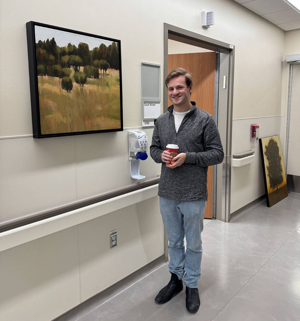 ArtWorks for Cancer volunteer Michael Murphy relishes the rustic tones of the painting Evening Shade by Susan Wilde, freshly installed in a corridor at Etobicoke General Hospital's Cancer Centre.