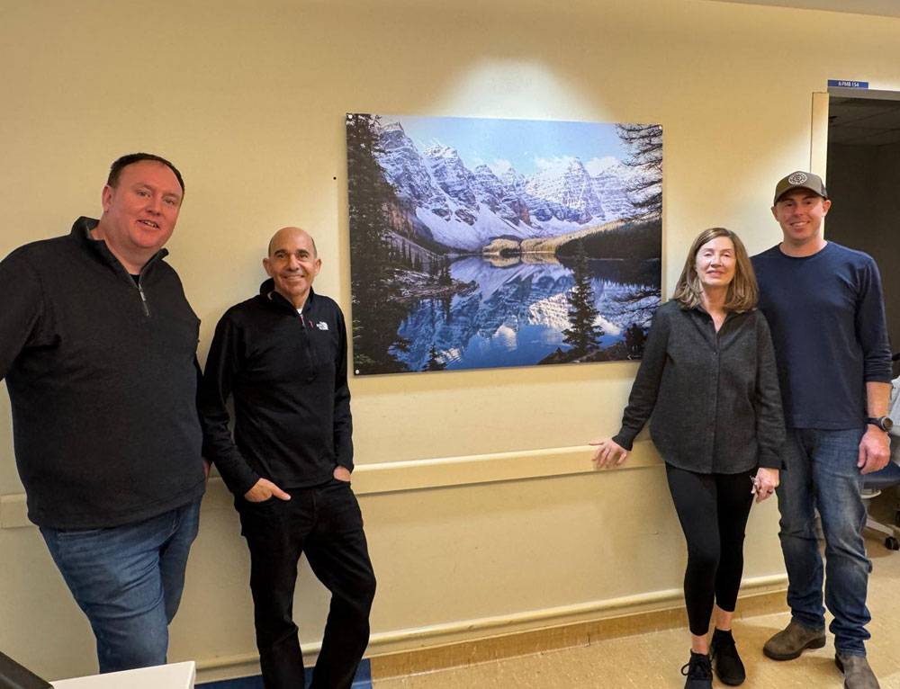 The installation team (left to right: Alan Loch, Bert Amato, Caroline Murphy of ArtWorks for Cancer and Tim Faught of Posterjack) admire Sophie Mendo's photographic work Moraine Lake, Banff National Park, Alberta in Unit 6PMB (Thoracic Surgery and Respirology Unit).
