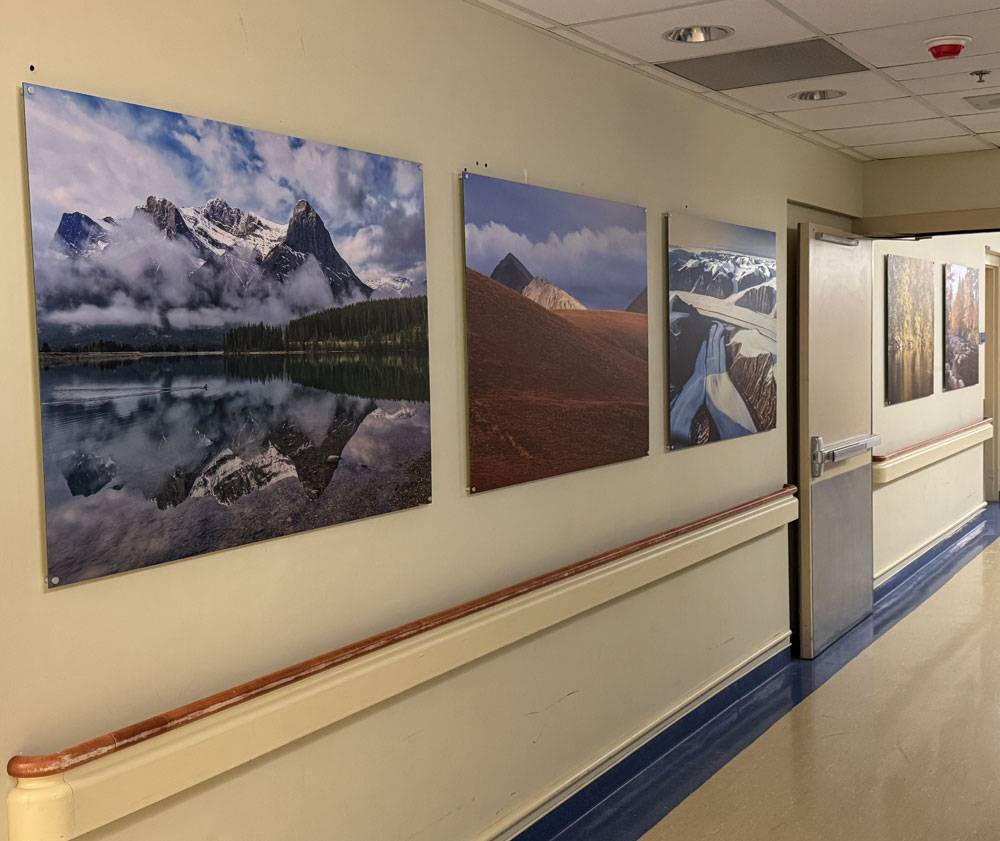 Exhilarating images of mountains by Sherman Hines, strikingly reproduced on metal by Posterjack, line a hallway in Unit 6PMB (Thoracic Surgery and Respirology Unit) at UHN Toronto General Hospital.